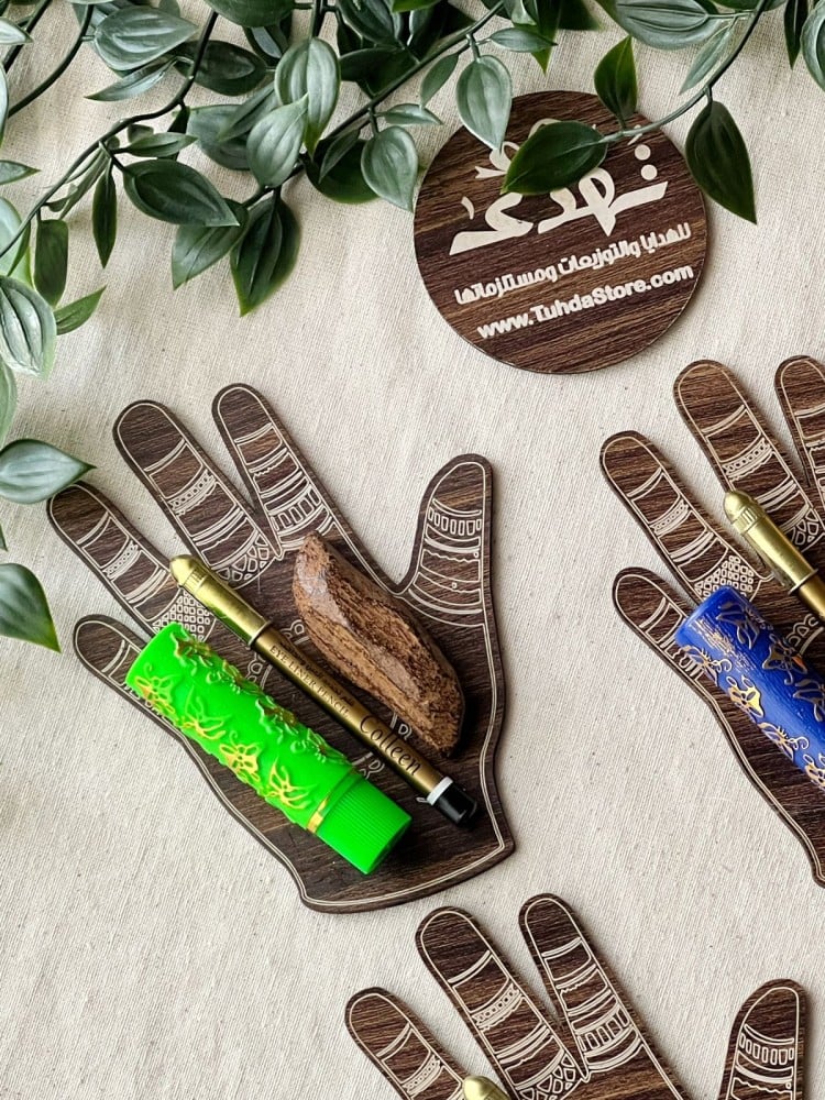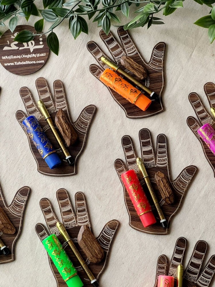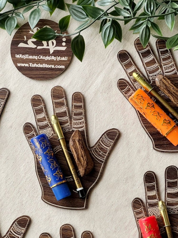 توزيعات 12 كف يد خشبي مع روج سحري وقلم كحل وكسرة عود موروكي